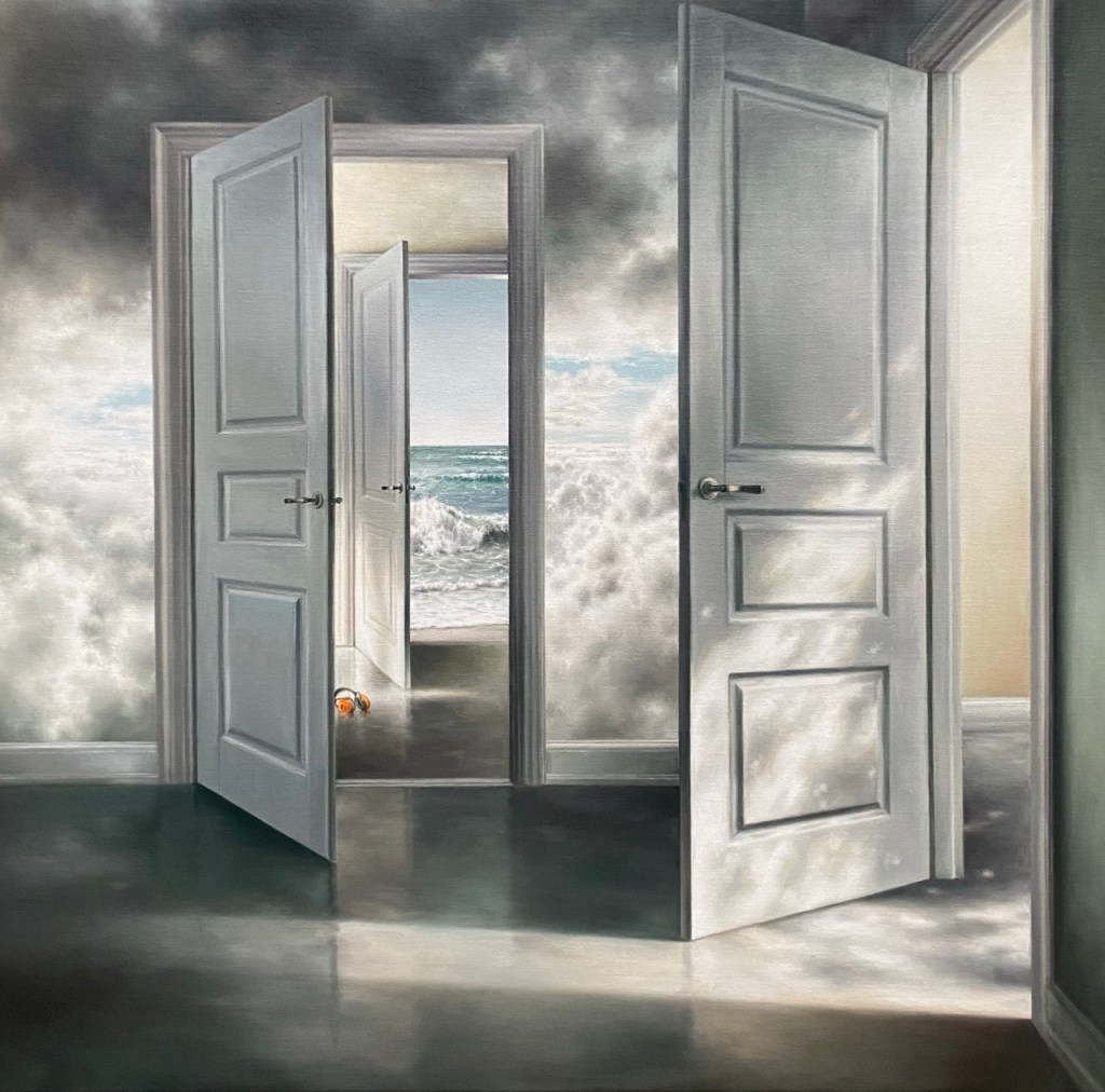 Mette Nørregaards malerier kan karakteriseres som “drømmende realisme.” Ofte mødes himmel og hav på uventet vis i mennesketomme rum. Døre står på klem til ukendte verdener og trapper lokker med nye udsigter eller indsigter.